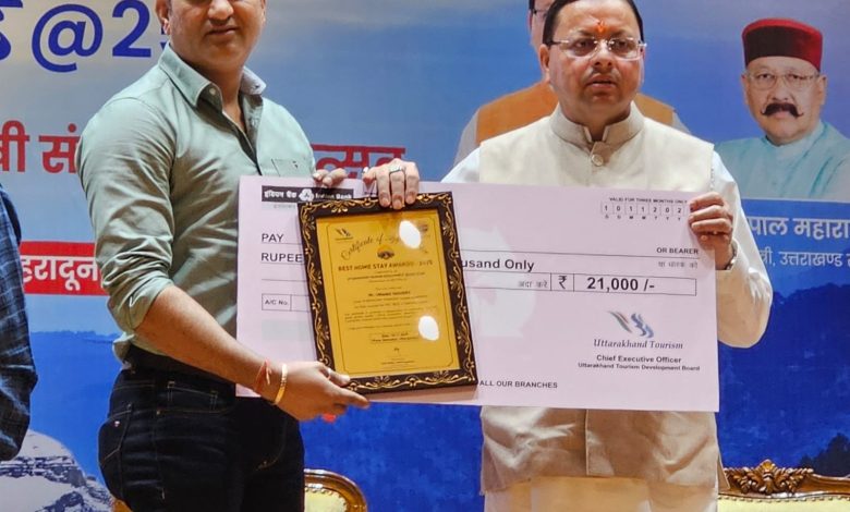 उत्तराखंड राज्य के स्थापना दिवस पर रजत जयंती महोत्सव पर पर्यटन विभाग द्वारा देहरादून में आयोजित कार्यक्रम में जंगलिया गांव (भीमताल) नैनीताल स्थित अरुणोदय होम स्टे को उत्तराखंड में सर्वोच्च स्थान मिलने पर माननीय मुख्यमंत्री पुष्कर सिंह धामी द्वारा अरुणोदय के संचालक उमंग वासुदेवा को सम्मानित किया गया । मुख्यमंत्री द्वारा श्री वासुदेव को मोमेंट ओ एवं 21000 रुपए का चेक देकर सम्मानित किया गया । पर्यटन को बढ़ावा देने के लिए निरंतर होमस्टे के कार्य प्रगति पर है व पर्यटक विभाग द्वारा जिला स्तर पर होमस्टे का चयन किया गया, जिसमें अरुणोदय होमस्टे को सर्वोच्च स्थान प्राप्त हुआ ।