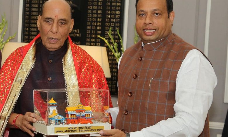 देहरादून/ नयी दिल्ली: 28 अक्टूबर। श्री बदरीनाथ – केदारनाथ मंदिर समिति ( बीकेटीसी) अध्यक्ष हेमंत द्विवेदी ने बीते सोमवार शाम को देश के रक्षा मंत्री, भाजपा पूर्व राष्ट्रीय अध्यक्ष राजनाथ सिंह से दिल्ली स्थित आवास में शिष्टाचार भेंट की तथा रक्षा मंत्री को श्री बदरीनाथ तथा श्री केदारनाथ धाम का प्रसाद, अंगवस्त्र, स्मृति चिह्न भेंट किया।