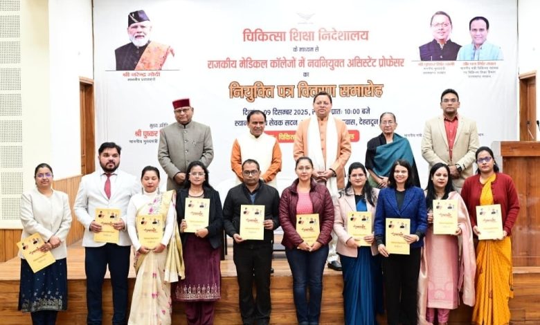 देहरादून, 09 दिसंबर। मुख्यमंत्री पुष्कर सिंह धामी ने आज मुख्य सेवक सदन देहरादून में आयोजित कार्यक्रम में प्रतिभाग करते हुए चिकित्सा सेवा चयन बोर्ड के माध्यम से चयनित राजकीय मेडिकल कॉलेजों के 142 Assistant Professors को नियुक्ति पत्र वितरित किए। मुख्यमंत्री ने नव नियुक्त Assistant Professors को शुभकामनाएं देते हुए कहा कि ये अवसर चिकित्सा के क्षेत्र को सशक्त बनाने की दिशा में महत्वपूर्ण कदम सिद्ध होगा। उन्होंने आग्रह करते हुए कहा कि सभी अपने छात्रों को गुणवत्तापूर्ण शिक्षा और प्रशिक्षण प्रदान करने के साथ उनके भीतर संवेदनशीलता, सहानुभूति और सेवा की भावना भी विकसित करें। जिससे वे कुशल और दक्ष चिकित्सक बनने के साथ समाज के प्रति अपने कर्तव्यों और मानवता के प्रति अपने उत्तरदायित्व को भी पूरी ईमानदारी से निभाएं। उन्होंने कहा कि प्रधानमंत्री नरेंद्र मोदी के नेतृत्व में राज्य सरकार, प्रदेश में स्वास्थ्य सेवाओं के विस्तार और सुदृढ़ीकरण पर निरंतर कार्य कर रही है। राज्य के प्रत्येक नागरिक को गुणवत्तापूर्ण चिकित्सकीय सुविधाएँ सस्ती दरों पर उपलब्ध कराई जा रही हैं। आयुष्मान योजना के अंतर्गत अब तक करीब 61 लाख आयुष्मान कार्ड वितरित किए गए हैं। जिसके माध्यम से प्रदेश के लगभग 17 लाख से अधिक मरीजों का रुपये 3300 करोड़ से अधिक का कैशलेस उपचार किया गया है। मुख्यमंत्री ने कहा राज्य सरकार प्रत्येक जिले में एक मेडिकल कॉलेज स्थापित कर रही है। जिससे सुदूरवर्ती क्षेत्रों के लोगों को उनके जिले में ही आधुनिक स्वास्थ्य सुविधाएं उपलब्ध हो सकेंगी। इनमें से पाँच मेडिकल कॉलेज पहले से ही संचालित किए जा चुके हैं, जबकि दो और मेडिकल कॉलेजों का निर्माण कार्य भी प्रगति पर है। देहरादून, हल्द्वानी और श्रीनगर मेडिकल कॉलेजों में सुपर स्पेशियलिटी विभाग भी स्थापित किए गए हैं। उन्होंने कहा कि सभी सरकारी अस्पतालों और मेडिकल कॉलेजों में स्टाफ की कमी को दूर किया जा रहा है। 356 Assistant Professors की नियुक्ति की प्रक्रिया भी गतिमान है। 1248 नर्सिंग अधिकारियों और 170 Technician को भी नियुक्तियां प्रदान की गई है और लगभग 600 नर्सिंग अधिकारियों की चयन प्रक्रिया भी गतिमान है। इस अवसर पर कैबिनेट मंत्री डॉ. धन सिंह रावत, विधायक श्रीमती सविता कपूर, श्री खजान दास, सचिव डॉ. आर. राजेश कुमार, निदेशक चिकित्सा शिक्षा डॉ. अजय आर्य एवं मेडिकल कॉलेज के प्राचार्य मौजूद रहे।